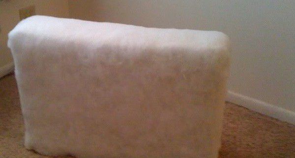 Для соединения двух составляющих дивана используется угловая деталь. Ее делают из любых листовых материалов в соответствии с шириной дивана. Спинку и нижнюю лицевую сторону оклеивают ватином, поверх которого размещают спандбонд. Заднюю сторону обивают хлопковой тканью.