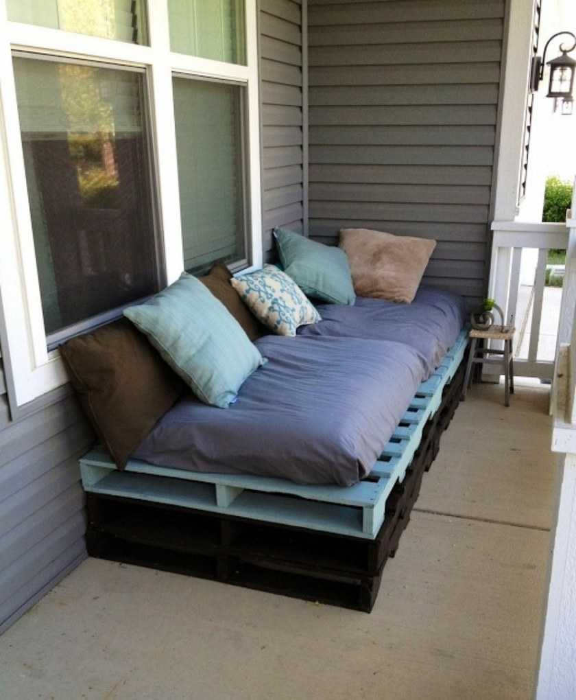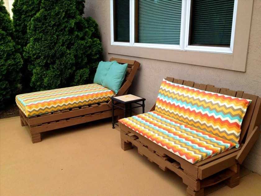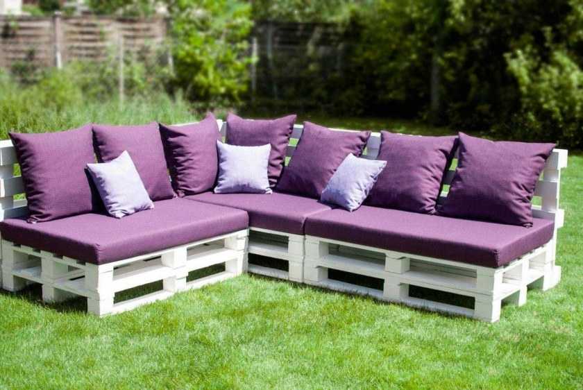 Оригинальный садовый модульный диван украсит любой дачный участок. На него можно положить яркий матрас, подушки в разноцветных чехлах. У такой конструкции достаточно быстро расшатывается спинка, поэтому лучше установить ее вплотную к стене.