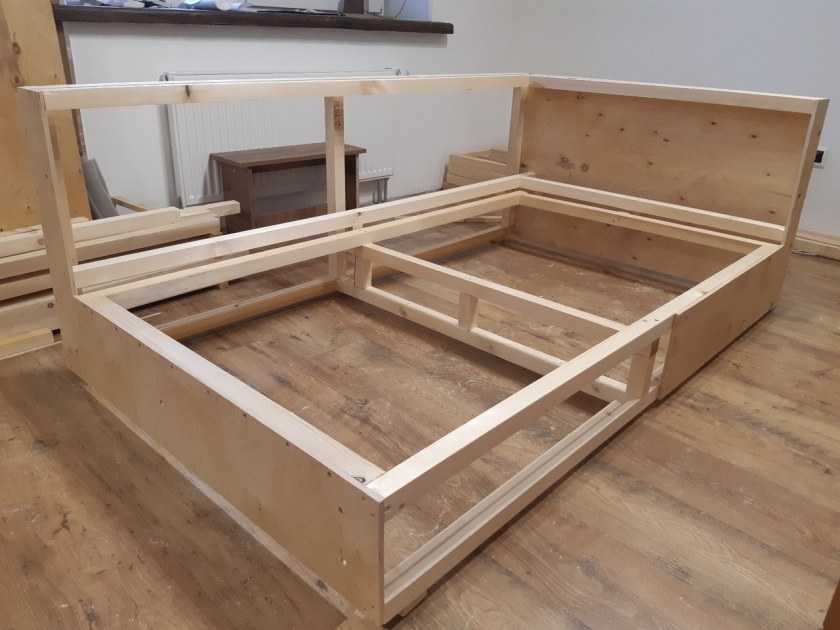 Это самая легкая в исполнении модель, например, сделать выкатной диван гораздо сложнее. Для работы можно использовать ДСП, брус, мебельный щит, качественным изделие получается из дерева. Как делать своими руками раскладной диван поэтапно: