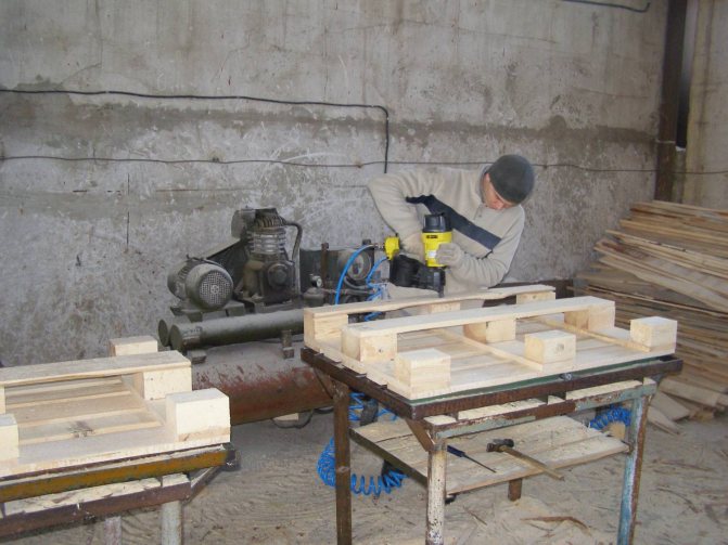 - Обработать паллеты антисептическим составом, чтобы они не гнили. Нанесение проводится послойно, максимум 4–5 раз, потому что изделие подлежит длительной эксплуатации на открытом воздухе. После финального слоя обеззараживающего препарата следует подождать несколько дней, до полного его высыхания. Если не выдержать рекомендованное время и приступить к монтажу конструкции раньше, защитное покрытие начнет быстро разрушаться и терять свои свойства.