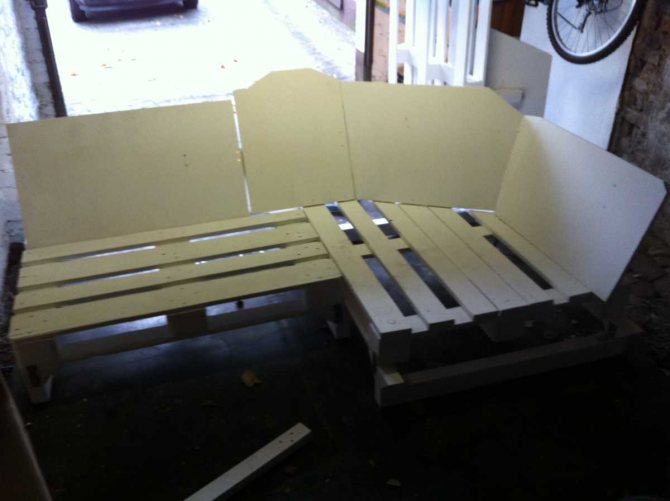 К угловой детали прикрепляют боковые, соединяя нижние части стенок. Далее для углового дивана своими руками надо сделать подлокотники.