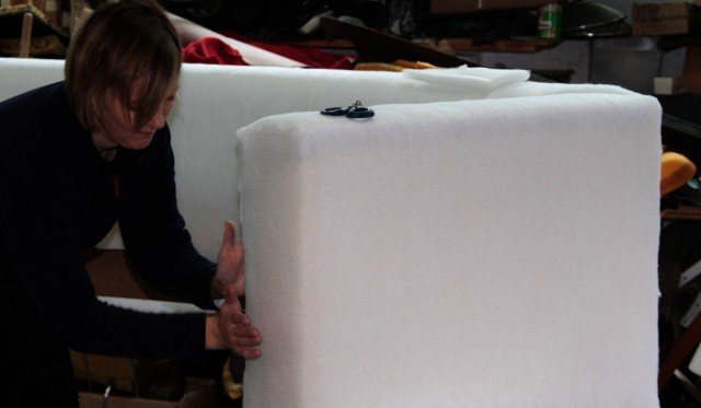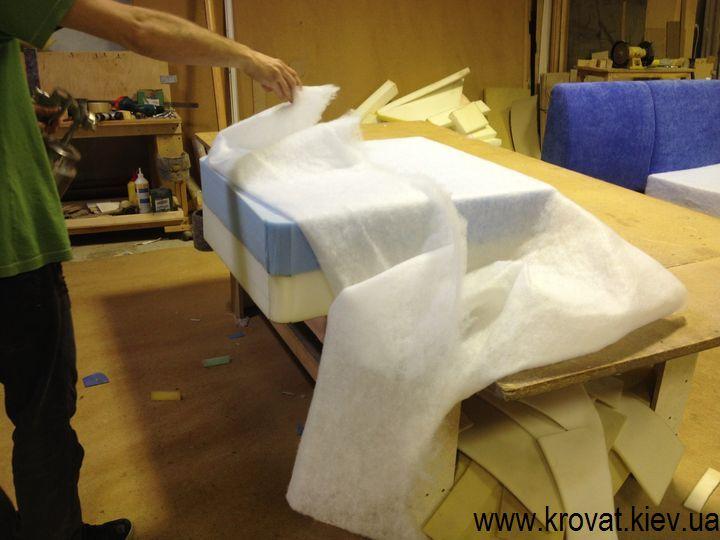Поверх ламелей закрепляют флизелин. На него укладывают поролоновые листы, толщина которых около шести сантиметров. Чтобы лист правильно разместился на каркасе и не закрывал механизм трансформации, вырезают кусочки в углах.