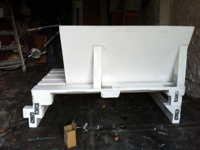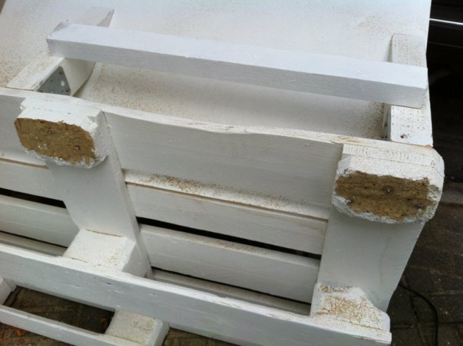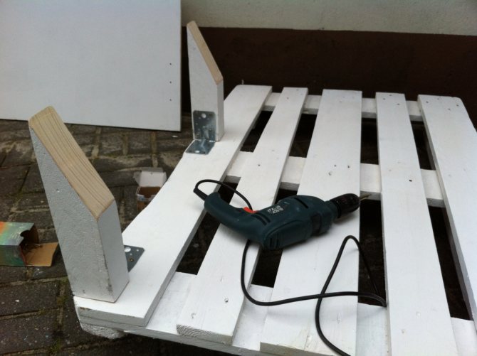 - Сделать подлокотники из брусков, зафиксировать их на боковинах. Закрепить уголками ножки — лучше, чтобы поддон не соприкасался с землей.