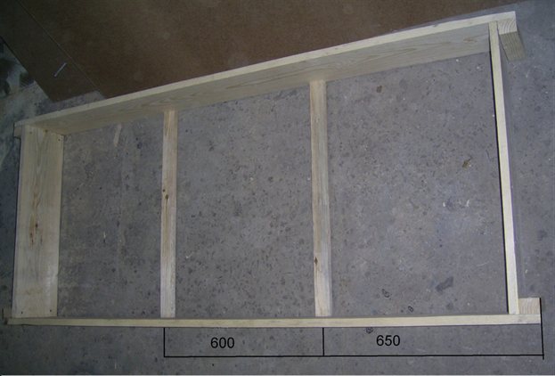 - Напомним, что эта часть конструкции будет служить основанием дивана, а значит, при эксплуатации на нее будет приходиться большая часть нагрузки. Поэтому для увеличения жесткости креплений, усиления конструкции устанавливаем внутри ящика еще две поперечные рейки длиной 800, шириной 200 мм.