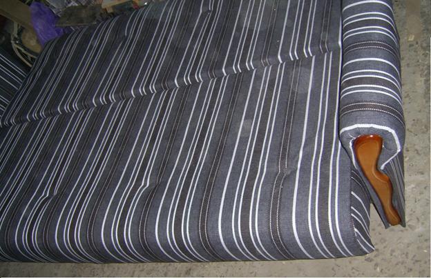 Все части разбирают и для каждого сиденья и спинки вырезают поролон отдельно. Его крепят клеем, а сверху мягкие детали обтягивают тканью. Тканевые детали выкраивают с припуском. Крепят ткань степлером.