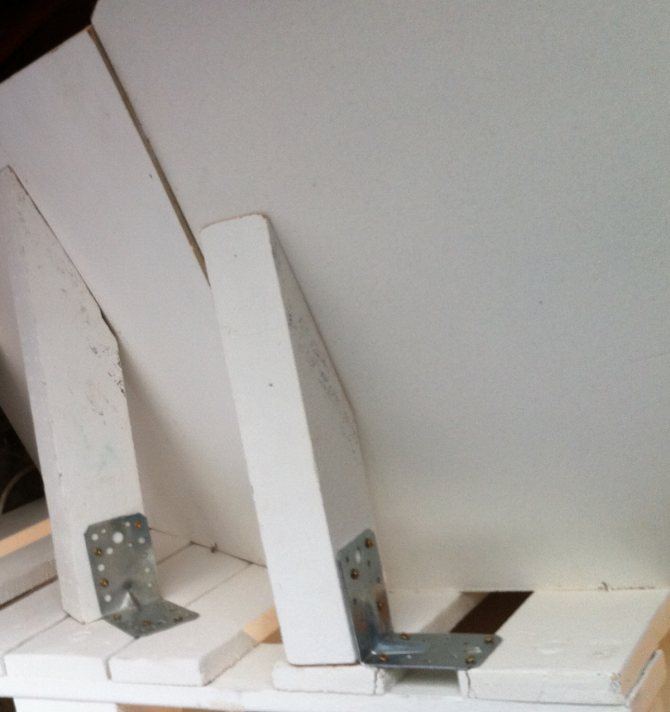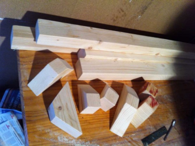Ножки делают из кусков бруса, в которых сделаны отверстия. Их прикрепляют к нижним рамкам, сделанным из углового плинтуса. Рамки прикладывают к каркасам и соединяют длинными шурупами через отверстия в ножках.