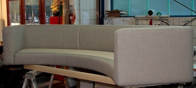 Готовые детали обтягивают тканью и прибивают к ним фурнитуру.