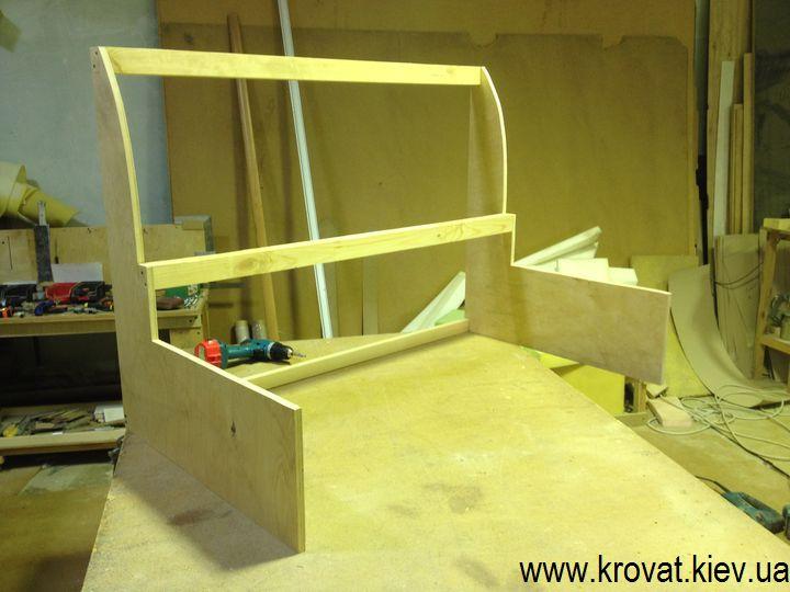 Боковины соединяют горизонтальными брусками. К ним крепят каркас спинки, который обшивают листом фанеры.