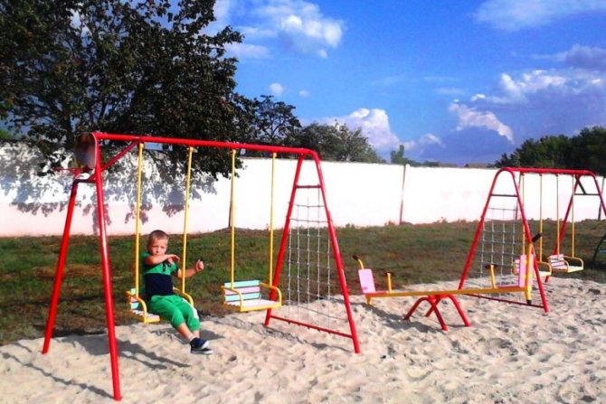 - Самая лучшая поверхность для монтажа качелей – песок, но для маленьких аттракционов (не выше 2 метров) допустим грунт.