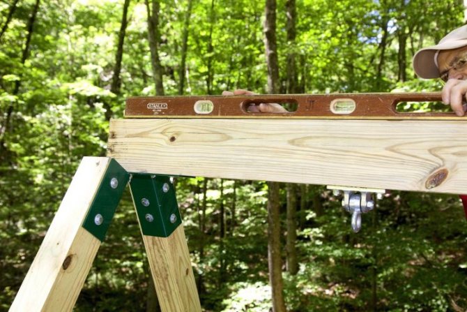 Однако здесь нужно правильно оценить свои возможности, поскольку для железной конструкции необходимо прочное основание, где придется применять сварку. Если подобными навыками вы не обладаете, то создайте проект деревянного изделия с цепными или веревочными крепежами. Обратите внимание на дуб, кедр, сосну или березу. При правильной обработке такая древесина не потрескается, не лопнет и не превратится в труху.
