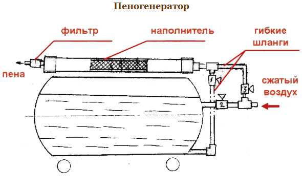 Для создания пеногенератора своими руками вам понадобятся компрессор, шланги, насос, емкость и корпус с металлической сеткой. Установите емкость на пол или на любое другое устойчивое основание, затем подключите шланги, предварительно оснастив их вентилями для регулировки давления. Не забудьте обработать соединения специальными муфтами.