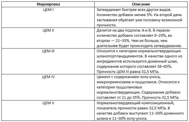 Определить скорость затвердевания конкретного типа цемента достаточно просто. Необходимая информация содержится в маркировке. Мы собрали данные о различных типах цемента в таблице.