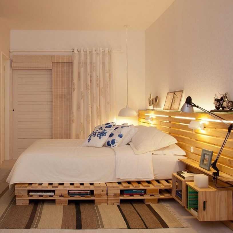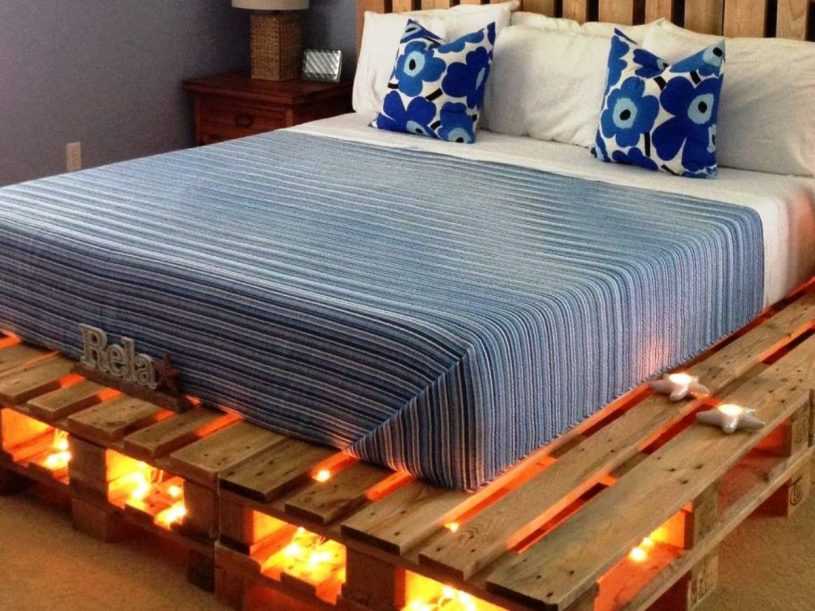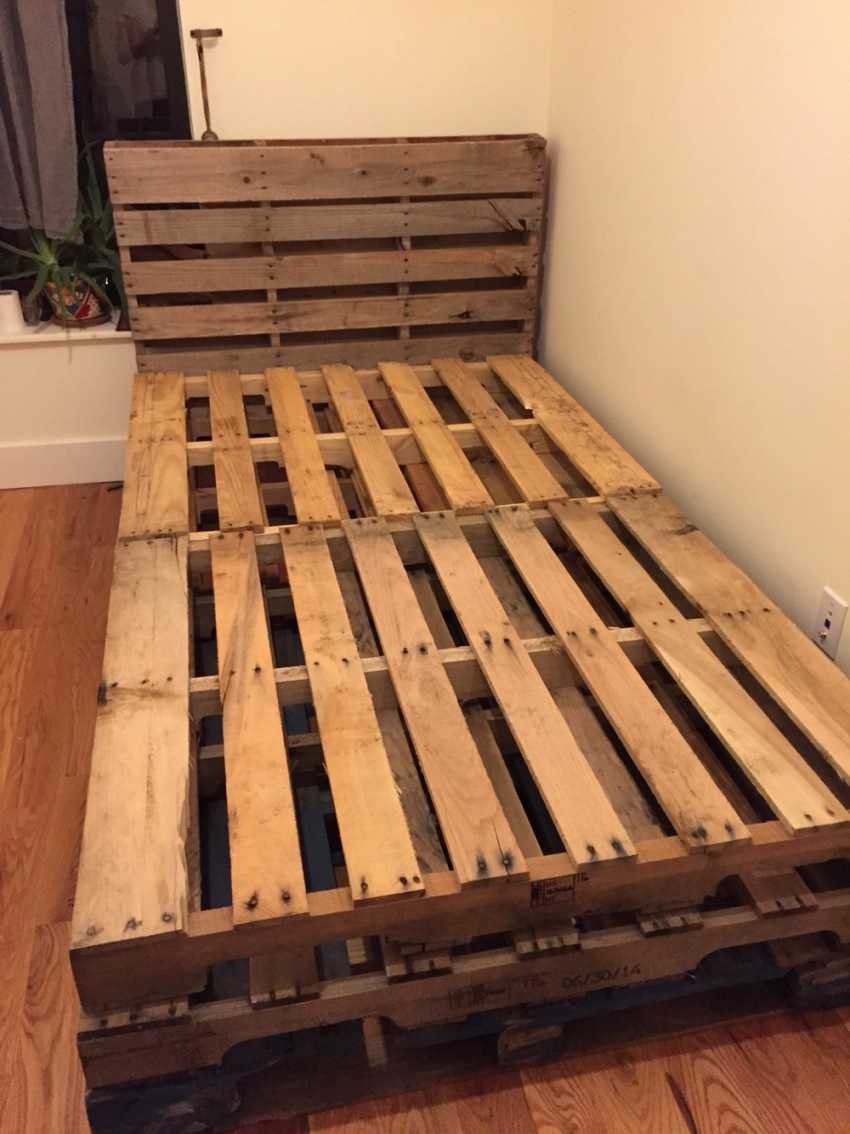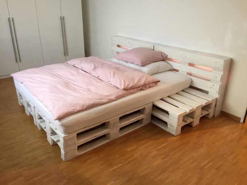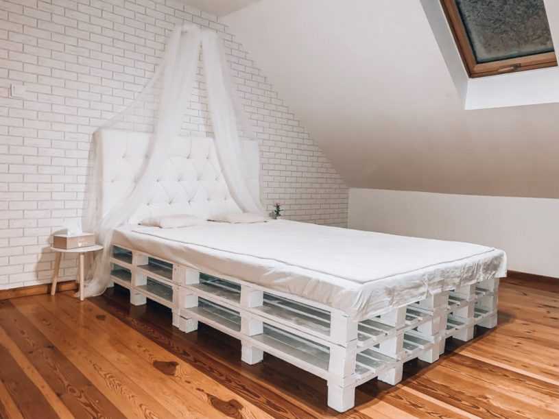 На изготовление обычной односпальной кровати с подголовником потребуется пять поддонов. Из четырех делают лежанку — изготавливают два блока из двух поставленных друг на друга и соединенных между собой поддонов, которые затем стыкуют и скрепляют по короткой стороне. Пятый поддон ставят на попа короткой стороной и прикрепляют в изголовье.