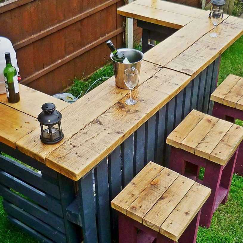 Предпочтительнее первый вариант, так как он более устойчивый. Для создания основания между собой необходимо скрепить четыре поддона. Два из них следует закрепить вертикально (в верхушке в форме «П»). Оставшиеся две паллеты крепятся горизонтально, благодаря чему появятся боковые стенки стойки для бара.