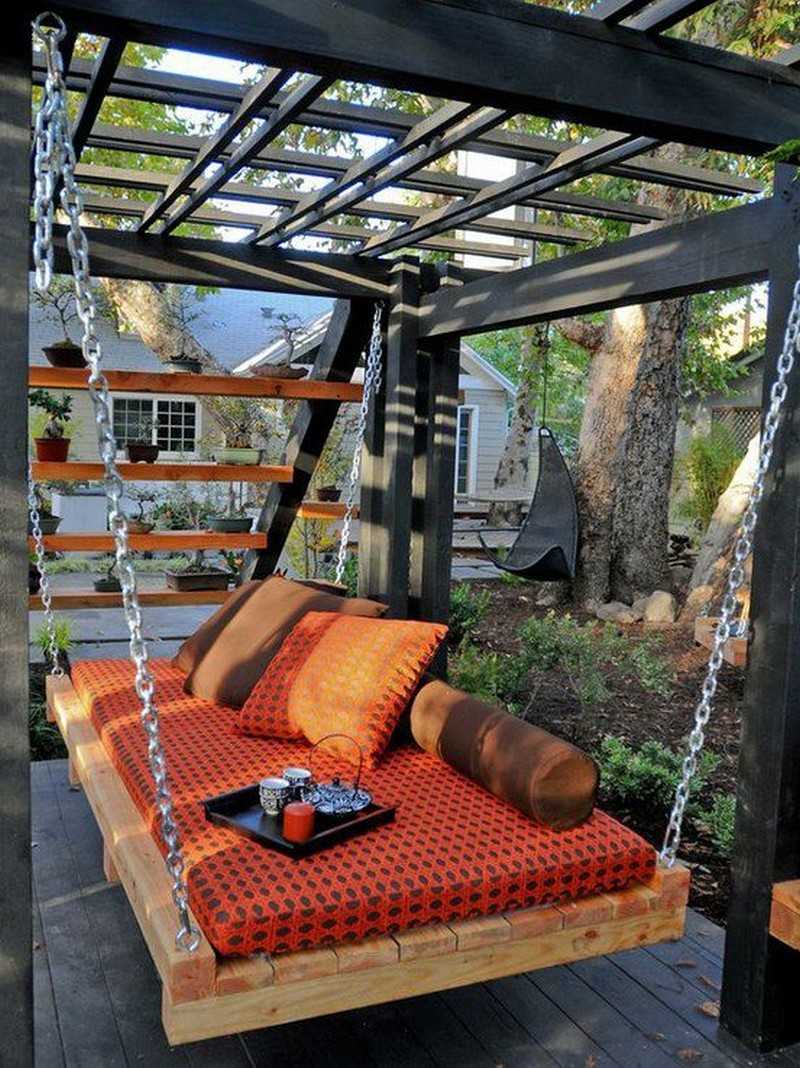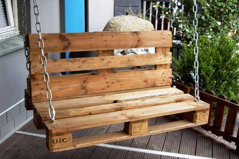 Из паллет можно собрать практически любые садовые качели на каркасе из брусьев с цепями. Это может быть маленькое детское сидение, широкая кровать с бортами на подвесах или просторная скамейка со спинкой и подлокотниками.
