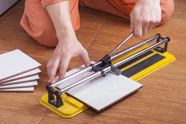 При укладке плитки невозможно обойтись без плиткореза. Если этот инструмент отсутствует, его можно заменить стеклорезом или чертилкой с победитовой насадкой. Использовать его довольно просто: нужно зафиксировать плитку по заранее намеченной линии и аккуратно провести роликом — и у вас получится нужный фрагмент.