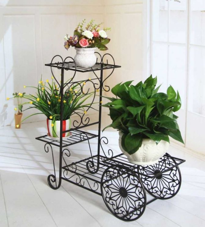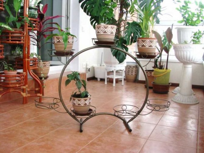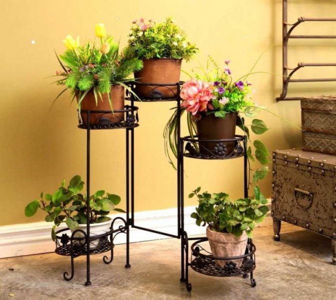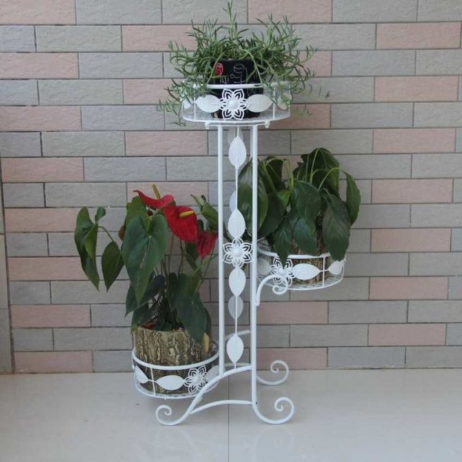 Для украшения собственного дома можно использовать не только подвесные конструкции. Например, металлические подставки для цветов отлично смотрятся вперемешку с деревянной и антикварной мебелью. Неплохим вариантом для такой стойки будет открытый летний балкон. А вот напольная комнатная подставка для цветов более габаритна, в отличие от подвесной. Масса заполненных горшочков в декорирующем элементе пола распределяется по всей поверхности, включая опоры, что минимизирует риск поломки всей конструкции.