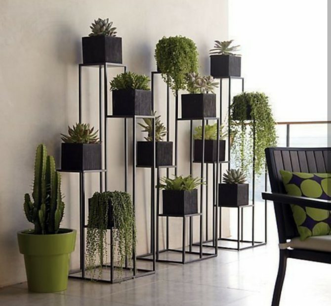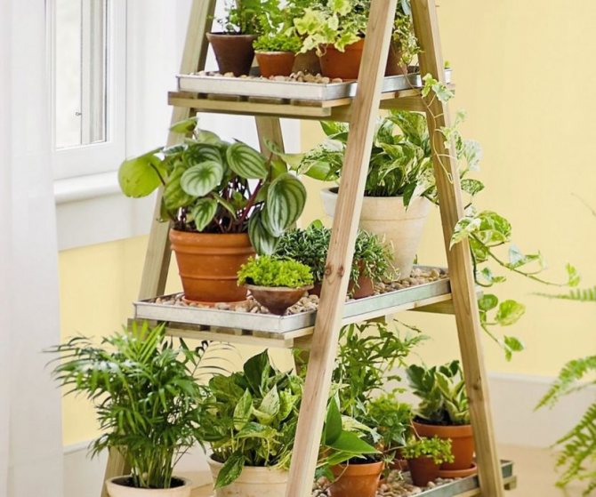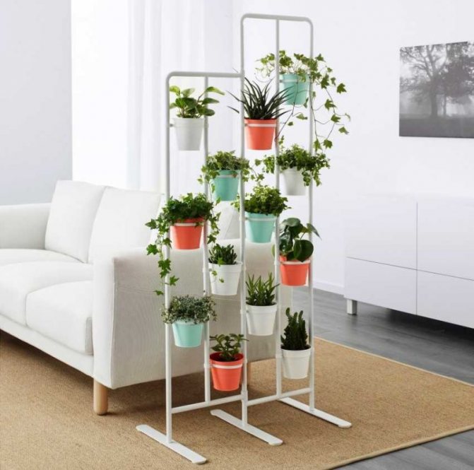Если вы не хотите разбивать пространство комнаты на несколько частей, то используйте изделия, которые будут не выше метра. Если вы выбрали для себя многоярусный стеллаж, то важно расставить цветы красиво. Мы предлагаем вам снизу ставить большие растения, а сверху расположить миниатюрные цветы. Чем больше цветок будет стоять на полке, тем прочнее должны быть подставки под него