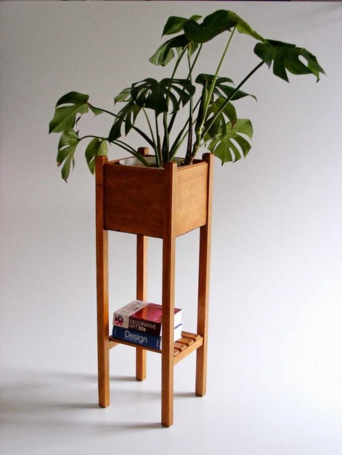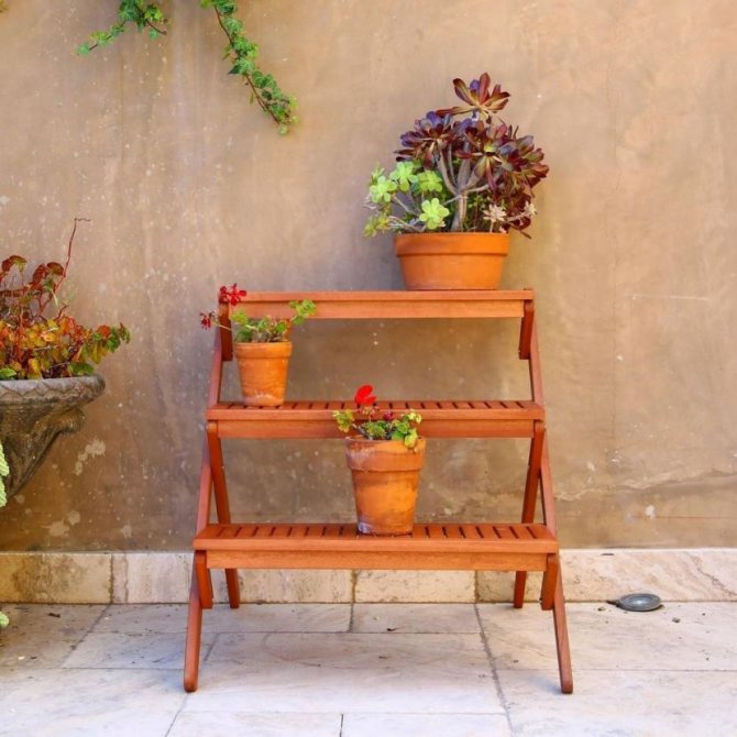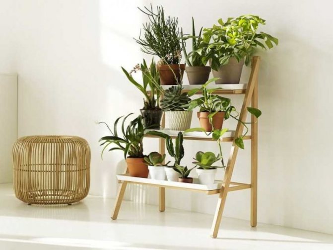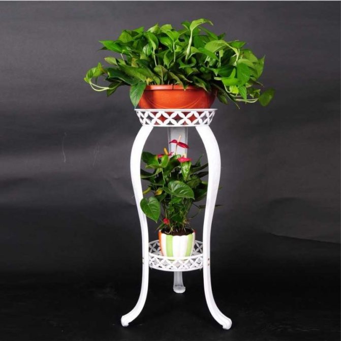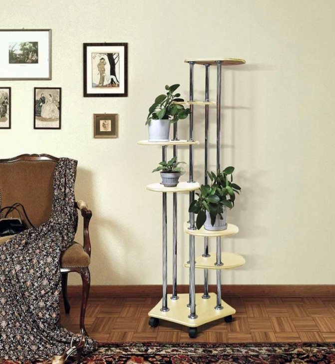 - Напольные. Самые прочные, надежные изделия, которые особенно подходят для крупных растений в больших тяжелых горшках. Они бывают различных конструкций — в виде стеллажей, этажерок, одиночных подставок, распорок, пирамид, А-образных форм, лесенок и др. Для их размещения требуется достаточно много свободного пространства.