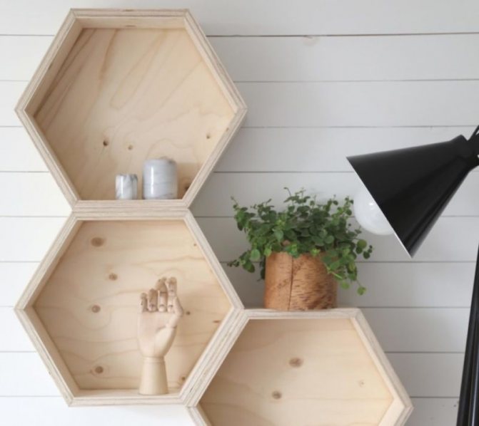- Настенные. Навешиваются с помощью различных крепежей на стены. Они позволяют больше сэкономить пространства, особенно угловые. Самые распространенные виды — этажерки, стеллажи, композиции из нескольких отдельно размещенных одиночных полок или различных оригинальных конфигураций (треугольников, квадратов, в виде сот и др.)..
