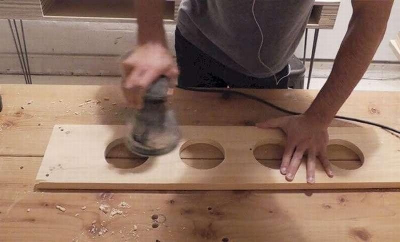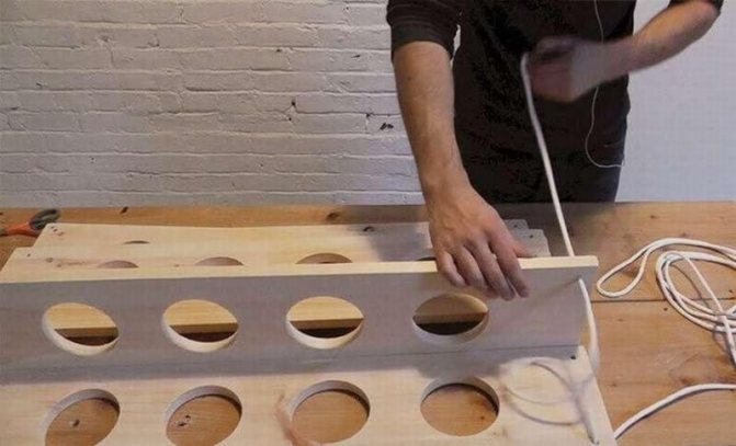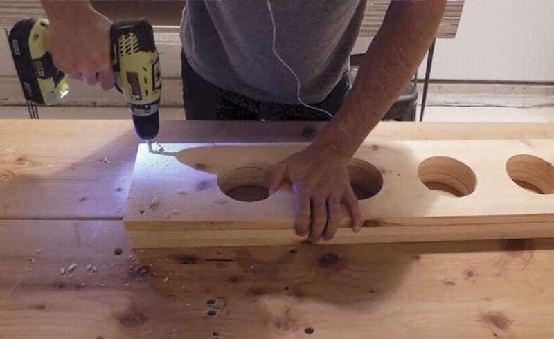 - сверлом Форстнера или фрезой сделать в подготовленных плитах отверстия, соответствующие размерам трубок, в верхней полке они должны быть не сквозными;
