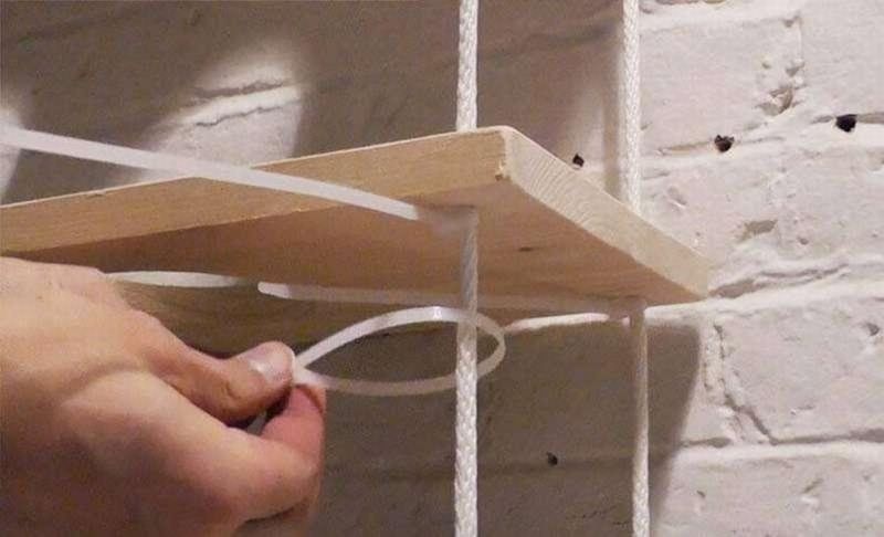 - Пронизывание веревки. Для создания шедевра почти все готово за некоторыми маленькими исключениями. Все, что останется сделать – продеть толстый канат через отверстия и подвесить полочку для цветов. После этого стоит завязать в нижней части крепкий узел, а сверху – создать петлю, если полочка будет подвесная.