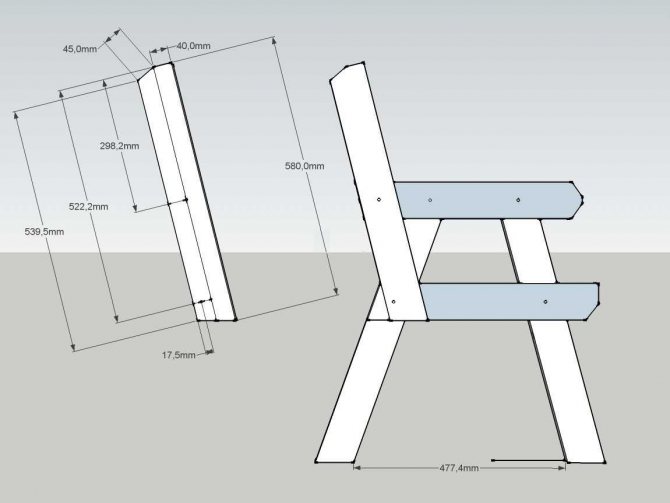 Первой отмечается высота лавки — 400 мм. Этот отрезок доски в обработке не нуждается. Начиная от отрезка нужно по всей остальной длине доски сделать срез в 20 градусов, который и формирует угол наклона спинки скамейки. Срезы на двух задних ножках должны быть одинаковыми как по высоте, так и по углу наклона. Иначе скамейка окажется перекошенной.